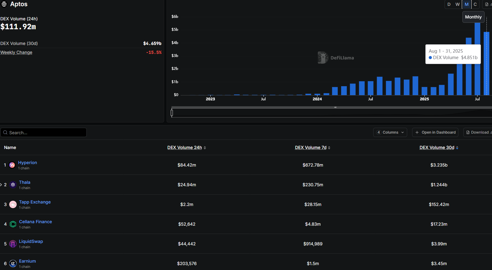 The data indicates that Aptos has developed a solid DeFi ecosystem marked by significant trading volumes.