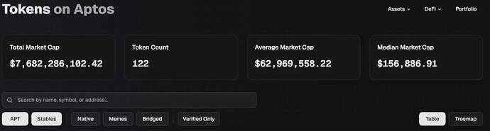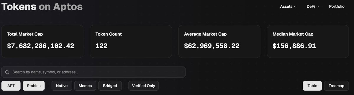 Currently, 122 verified tokens are active on the Aptos blockchain, categorized into Native