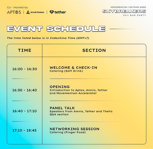 The Vietnam Web3 Skybreakers Event is shaping up to be an exciting opportunity for Web3 enthusiasts and professionals alike. Co-hosted by Aptos, Amnis Finance, and Tether, this event will feature insightful discussions about the future of Web3, valuable networking opportunities, and a stunning venue with panoramic views of Hanoi. Whether youโre deep into the Web3 space or just getting started, this is a great chance to learn, connect, and enjoy the evening.